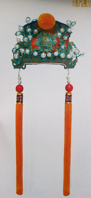 帅盔:戏曲中领元帅位者戴此,帽顶有戟或枪顶,有倒缨。