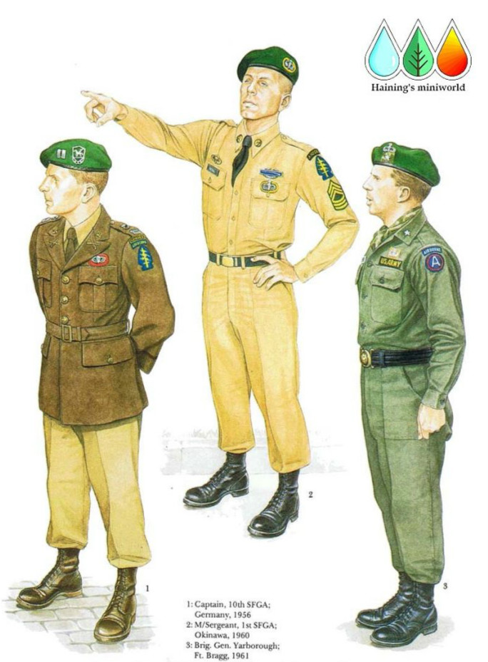 陆军的绿色制服在1957年开始采用,并经历了多项细微的变化。灰绿色衬衫在1976年替代了茶色的府绸面料版本,而与这种衬衫相搭配的是陆军绿色裤子,许多时候这一搭配可以不穿上衣。1985年,这身制服替代了陆军的土黄色和茶色(热带精纺毛)制服,其中长袖和短袖的版本都在使用。“科科伦”(corcoran,本来是靴子的牌子,后来变成类似产品的统一称谓)跳伞靴通常被所有特种部队、游骑兵和空降部队人员在穿常服时搭配穿着。人物左臂上第1特种行动司令部的臂章上方是新的特种部队资格铭条章。服役条纹章展示在左袖子上,每一条代表三年的服役期。左胸前的略章是所有的个人嘉奖,右胸前的则是用金框框住的部队嘉奖。南越人的特种部队跳伞飞翼章则佩戴在那些部队嘉奖的上方。