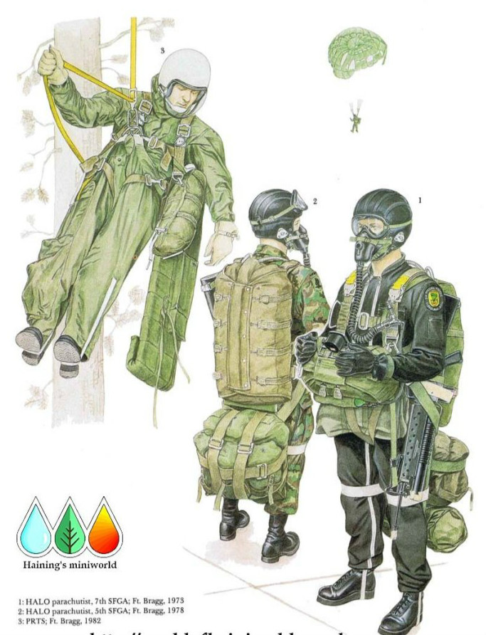 高空空降低空开伞(HALO)的概念是第77SFGA在1957年至58年间发展出来的,它着力于对运动跳伞技术的改良以适应军事自由落体伞降的需求。这一技术的目的是将伞兵直接投送到行动区域并且由于是在极端高度的4万英尺进行,所以飞机很难被发现和/或被摧毁。HALO的课程由特种作战中心管理,而之前的操作者则是个别的特种兵团。这些兵团通常维持一些被称作“A队”的有完全HALO资格的作战分遣队。图中这名跳伞者身穿他自己的跳伞服和法国造的跳伞靴,后者经常在训练时使用,而不是实际行动中。MC-3型皮制跳伞头盔与MBU3P型氧气面罩相搭配,因为1万英尺以上就需要氧气供应了。在飞机上时,面罩的供氧软管可以插在机载供氧系统上,跳伞之前则与“应急跳伞”氧气罐相连接直到准备跳伞之前,而氧气罐提供的氧气可以维持大约15分钟的供氧量。主降落伞是A/P28-3型,它带有35英尺长的橄榄绿色可操控降落伞伞衣,也就是说在圆形伞衣后面带有巨大的有可操控目的的椭圆形气孔,并且需要熟练的滑绳操作技术来操控。用绳带捆在他身侧的是配备M203型40毫米口径榴弹发射器的M16A1步枪。臂章则是第2SFGA-A连的运动跳伞俱乐部徽章,这支部队是这名士官先前所在的陆军预备役部队,60年代初,其基地位于俄亥俄州的克利夫兰。