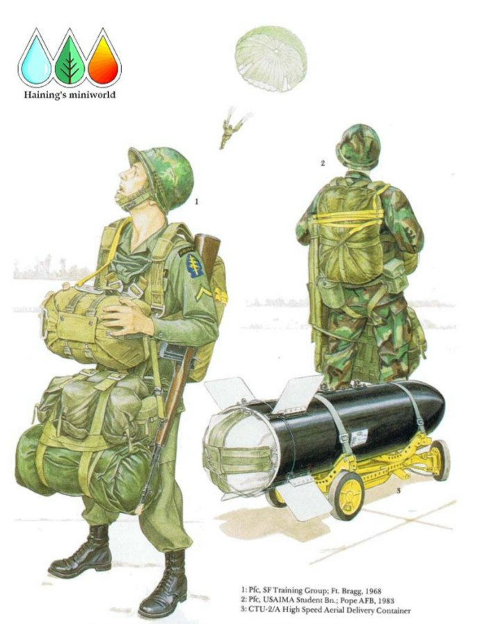 这名跳伞者装备晚期版的MC-3型自由落体降落伞具,它包含了军用版的“运动副指挥员I型”伞衣(打开形状在人物背景中可以看到)。这种操控性极强的24英尺长的伞具有橄榄绿色和迷彩色两种版本。备用伞采用平圆形不可操纵的伞衣。人物的背包是巨大的LC-1型先进轻型个人携行装备(ALICE),它用皮带固定在跳伞者身背后的LC-1型框架内而不是像使用固定伞绳的跳伞者那样固定在身前,这将增加做自由落体运动时的稳定性。额外的小队用装备坠在可自由落体下降的困扎包裹中,它带有自己的可自动打开的降落伞。自由落体跳伞者往往在2000英尺的高度人工展开他们的降落伞,一支测压表可以测定这一高度。当在FF-2型自动开伞索打开后,其备用设施可以使用。另外,士兵携带的武器是M16A1步枪。