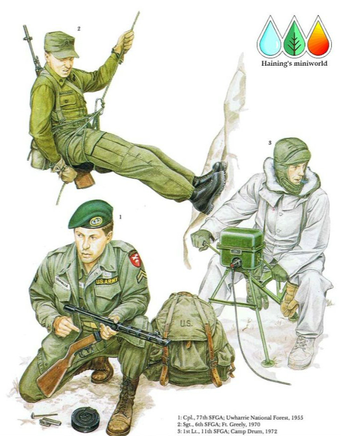 这名武器专家扮演着“游击队”的角色并手持苏联的PPSh-41型冲锋枪。这一时期第77SFGA使用的是加拿大造的贝雷帽。他穿着斜纹布杂役服和一件M1953式野战夹克。在1955年的时候,二战时期(一直使用到1948年)的军衔V字章重新取代了小号的但不受欢迎的深蓝色底金黄色V字章。