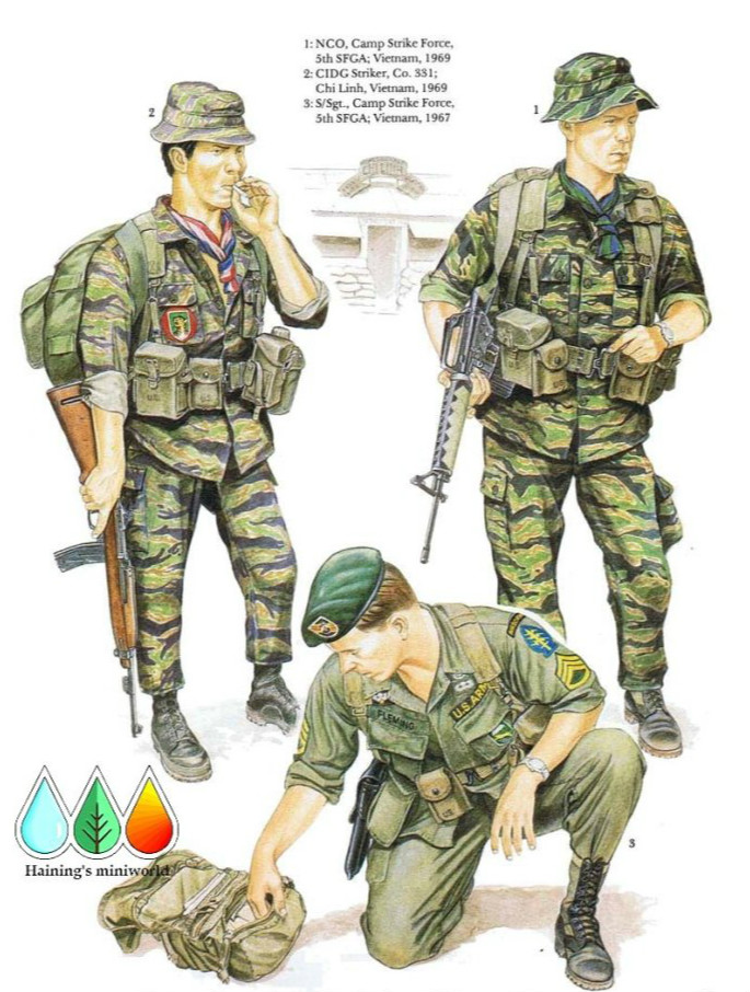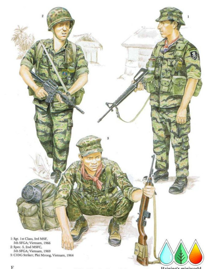 被直接分派到“机动打击力量”(Mike force)的这名士官穿着60年代初开始装备的早期版本“虎皮纹”迷彩服。小的“香烟口袋”出现在裤子上,同时在一些事实上作为野战服装的衬衫的袖子上也同样存在。中士的丛林靴是没有脚踝部起加固作用的带子的早期版本。他的红白蓝三色围巾被“机动打击力量”部队广泛使用。而其中一些部队还使用不同颜色的领巾,比如浅绿色,它是作为个人展示部队等级嘉奖的方式来出现的。在他胳膊上展示的是老的“机动打击力量”的徽章。这种徽章是被非特种部队的更高级司令机关禁止佩戴的,因为骷髅头加交叉骨头的图案并不适合象征自由世界的军队,也会让人曲解“机动打击力量”的存在意义,因此在1968年它被类似于图F2的那种徽章所取代,但加上了虎头和虎头后面的黑色降落伞图案。中士的武器是老式的M16步枪,它的叉头状消烟器很容易剐住树枝,同时其右侧没有枪栓辅助组件。在他的M1956式个人携行装备上固定着M26式爆破手雷和M1895式彩烟手雷,后者能够散发出黄色、红色、绿色和紫罗兰色的烟雾。