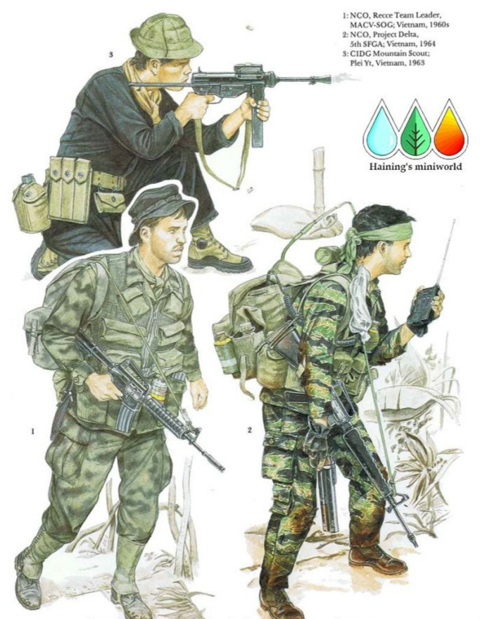 这是美国特种部队侦察队成员的典型复合画像。在MACV-SOG 存在的8年间,出现了种类广泛的制服和不同的装备组合,它们根据时间、个人经验、任务的需要和其他环境因素来变化。图中展现的制服是一种带如同飞溅的色斑图案的丛林杂役服。虽然出现范围有限,但在丛林的夜晚和日间的斑驳阴影中它却非常有效。被染成黑色的橄榄绿色和迷彩色丛林杂役服以及各种版本的“虎皮纹”迷彩服也在使用。橄榄绿色丛林杂役服最为普通,它在一定距离内呈现出与北越军队的制服类似的深绿色调。在任务完成后,制服需要用杀虫剂浸泡并风干。所有样式的帽具都在使用,其中包括了被裁剪过的丛林帽和三角形的制式绷带制成的头巾,后者的使用更为普遍,这要归结于它们具有欺骗性的外观。图中人物头戴黑色帽子,黑色作为“日间可视颜色”的使用是便于侦察小组成员能彼此识别的一种尝试。丛林靴是最普通的鞋具了,但为了追求获得具有欺骗性的足迹,他们采用了穿“胡志明式”凉鞋、将夹板鞋磨平鞋底、用抹布包住鞋底或套着厚袜子的各种方式。美国陆军内蒂克(Natick)实验室甚至提供了经过基础性试验的数量有限的改良丛林靴,它们的鞋底模仿越南当地人的赤脚或凉鞋的足(鞋)底样式。M1938式帆布护腿(如图所示)被侦察队的部分成员使用,以防止蚂蟥的侵入。他们身上不佩戴任何种类的徽章,但大多数侦察队的成员会佩戴属于他们自己的非正式的徽章。这些徽章会被他们缝入美国特种部队人员专用的贝雷帽的内衬里,在前进基地时,个别人员还会将它们展示在胸前口袋上。