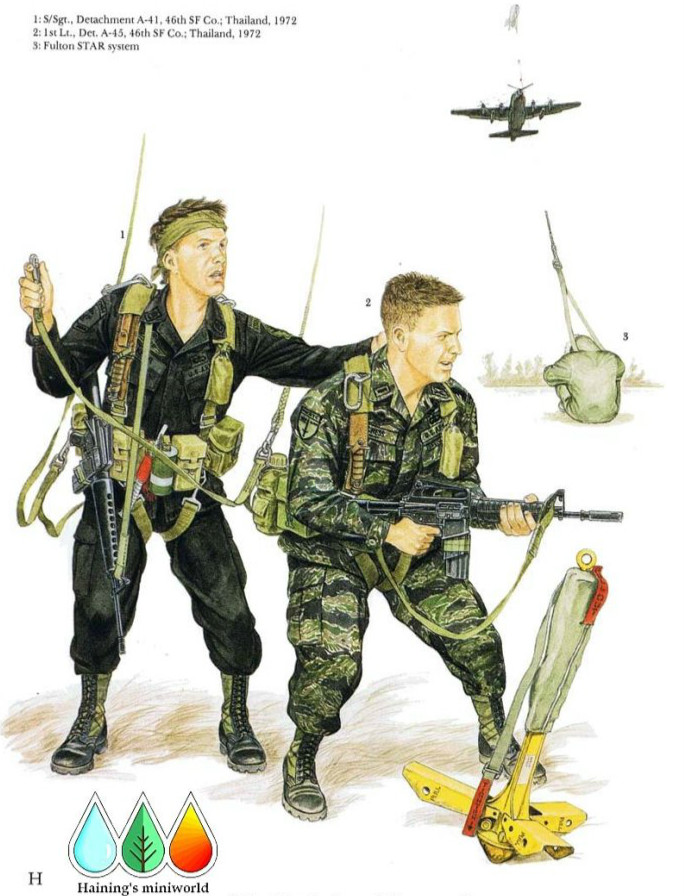 图中这名中尉身穿皇家泰国陆军(RAT)特种部队的标准迷彩服,它在第46连的美国特种部队人员中非常流行。中尉右胸口袋上方是柬埔寨跳伞飞翼章,左胸口袋盖上是“特种部队”字样的铭条,那是所有支援RTA特种作战中心的组织的人员都佩戴的。另一种非授权的战斗徽章佩戴在右臂上,这是为柬埔寨军事装备交货小组(MEDTEC)设计的几种徽章中的一种。这些徽章只在执行顾问和训练而非行动任务中才使用。中尉的军衔徽章和步兵的交叉步枪图案兵种徽章对称水平排列在领角上,这是泰国人的习惯,也是使用当地裁缝造成的结果之一。人物的携行装备(LBE)是MLBE系统,并加上了STABO 降落伞背带。他的武器是XM177E2冲锋枪。人物身前的地上是“丛林穿透器”,这是直升机装备的用于救援升降的装置。它带有一个沉重的“矛头”和可折叠的坐垫,这样它可以穿透枝杈密布的树冠。一到三人能通过这种装置拉伸到直升机上,在升降过程中,还有安全带将人固定在座位上。