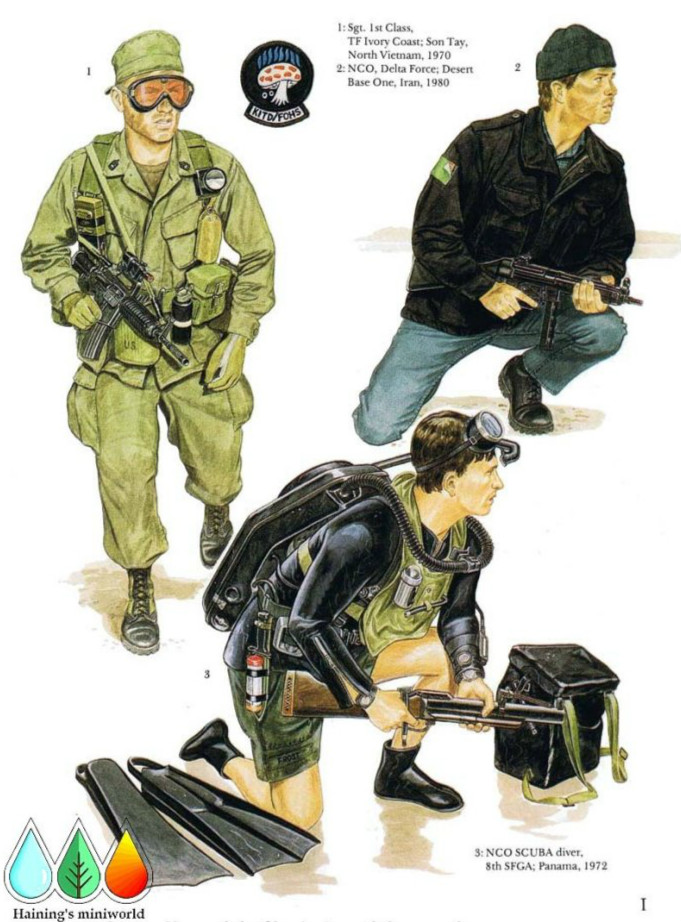 对于突击队员们设定他们的个人装备给与一定自由是一个好主意。当然,他们的个人任务也要求他们使用标准的M1956式携行装备作为基础性的个人装备。当时缺乏相应的制式携行器具的情况下,水壶套往往被用来装XM177E2冲锋枪的30发装弹夹。人物左肩头的背带上固定着一盏矿工用灯,它的下面是装闪光灯的口袋。右肩背带上固定的是AN/PRT-4A型电台信号发射器(没有携带接收器,它只能在适当地点报告使用者的位置)。这名中士还戴了标准制式的护目镜,护目镜粘上了红色贴膜以保护眼镜不受空降时照明弹的损害。又要对手部起到保护作用,又不要像大多数手套那样影响对武器操控和锁定的感觉,他手上戴了空军的夏季飞行薄手套。所有突击队员在橄榄绿色丛林杂役服上只佩戴军衔徽章。52名突击队员中的大多数都使用的都是XM177E2型冲锋枪。阿玛莱特单点(Armalite singlepoint)夜视仪固定在冲锋枪的提把上。这支部队所携带的其他轻武器包括了M60式机枪、M79式榴弹发射器、M16A1步枪和12分度口径的防爆散弹枪。作为补充,大多数人还分别携带了一支M1911A1式手枪和若干手雷,后者大多数为MkIII型攻击手雷,也就是通常所说的“震击”手雷,其名称的由来源于其能产生伴随少量爆破效能的巨大冲击波。所有成员还都携带了无数种求生和解困装备。