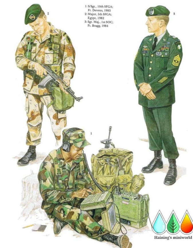 人物的个人携行装备包括了包含装M16A1式步枪的30发装弹夹的弹夹包的ALICE式装备。背包是ALICE系列的巨大的LC-1型,它旁边则是M16A1式步枪。图中的电台是新装备的AN/PRC-70型,与之搭配的是OA-8990/P型数字信息设备组(DMDG)。DMDG是一种脉冲信号微电脑信息处理系统,操作只需按键几秒钟而不是用莫尔斯电码本那样需要好几分钟时间,这让敌人的电台定向侦测仪很难发现其信号发出的位置。DMDG加上几乎没有传输距离限制的AN/PRC-70作为完美的组合可以很好地满足特种部队特殊的通讯需求。这些装备替代的是老式的AN/PRC-74B型电台和AN/GRA-71型脉冲编码设备。