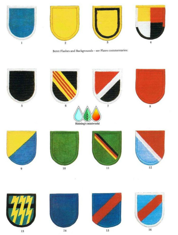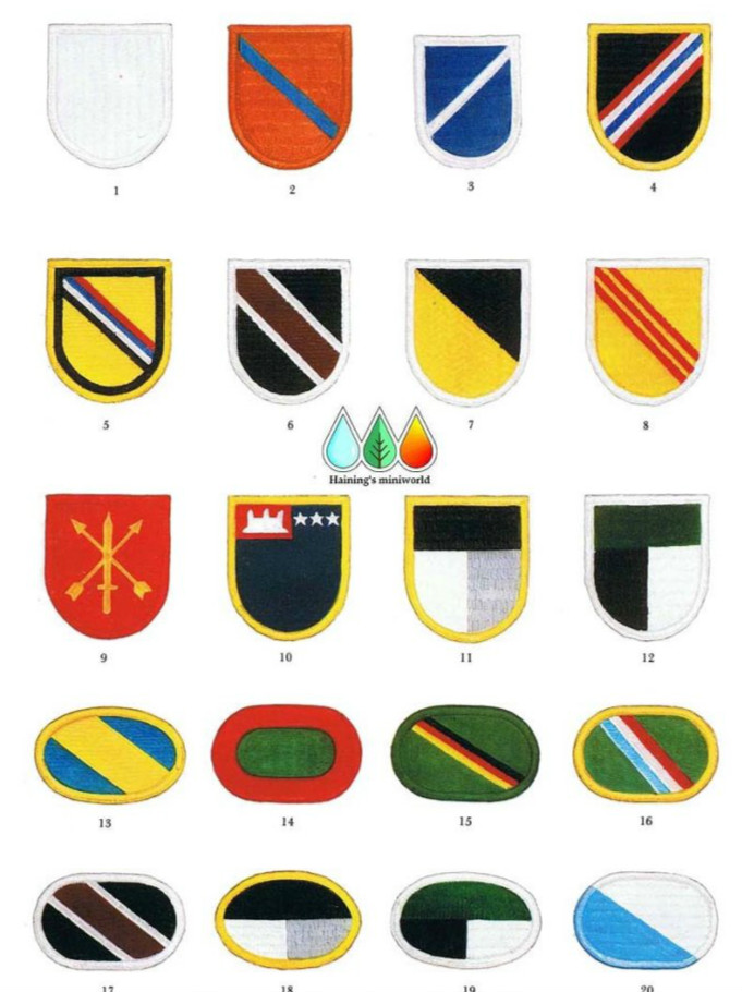 1963年12月,经核准使用的这种识别标上的色彩分别代表第1、5、7SFGA以及特种部队训练团,其颜色是这些部队的成员分别画上去的,而非某些报道所说是代表非洲的标记。有时候它也被称作“废物”或“Purina中国狗”。