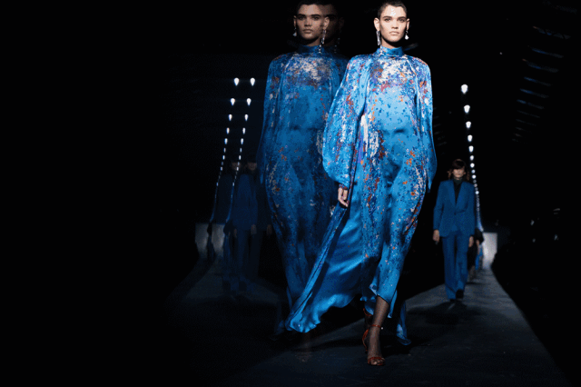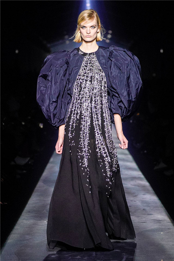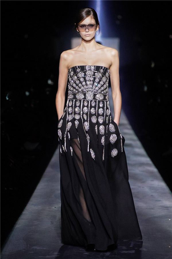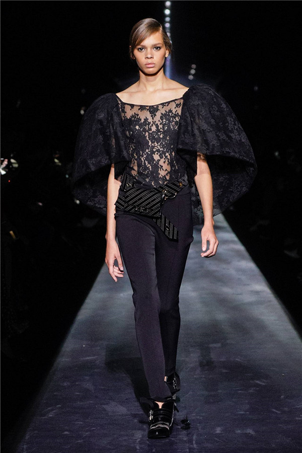 在偷食禁果之后,亚当与夏娃被上帝流放,坠入失乐园。而最终的晚装部分则汲取了这堕落过程中的黑暗与凄美的力量,就像一首壮丽的挽歌。钉珠与刺绣布满在黑色的裙身上,像流星一般的水晶洒落在套装的领口,它们在秀场闪光灯的作用下反射着光。Waight Keller钟爱这种璀璨的效果——锋利、凶悍以及具有爆发力的女性美。即使知道会坠入深渊,也要品尝那禁果的滋味。