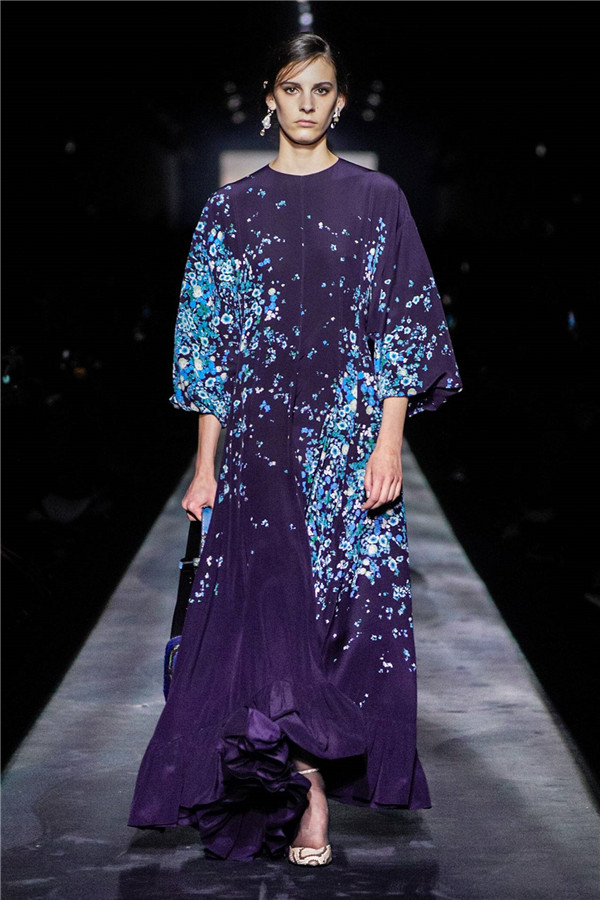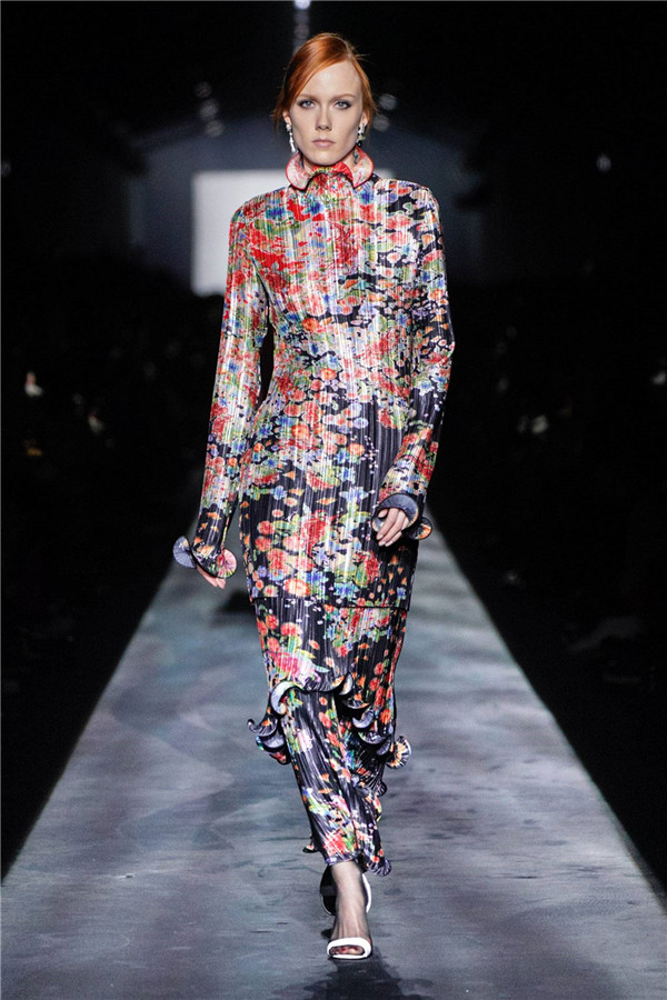 真正能让人联想到伊甸园的是各种褶皱面料上的印花,绽放又蔓延不断,开到荼蘼芳菲尽的灿烂,结合着弯曲的犹如花朵盛开的领口、袖口、裙角,展现出女性独有的优雅诱惑。