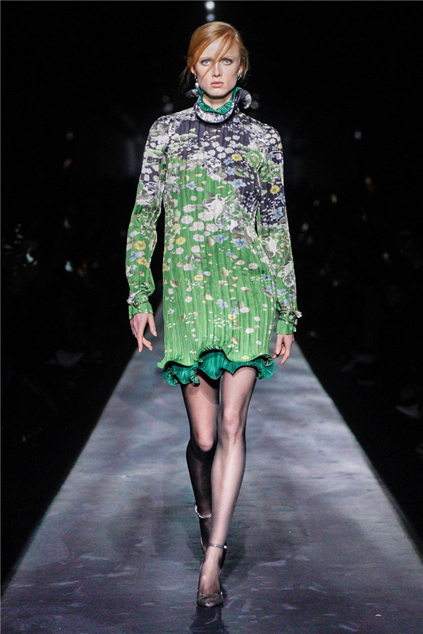 之后出现的紧身褶皱长裙包裹在模特的身上,领口和裙摆处则做出了荷叶边的效果。裙身描绘的是伊甸园的场景,一派自由又欢愉的景象,甚至美好得有些虚假。这些女孩看上去就像一条婀娜的蛇,对,就是诱导夏娃偷食禁果的那条。