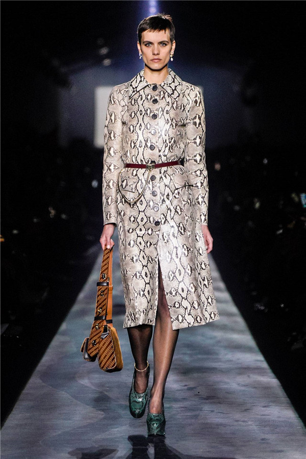 伊甸园中诱导夏娃偷食禁果的那条蛇也是Clare Waight Keller的灵感所在,精致纹路的蛇皮印花元素也运用到本季大秀上。让我们仿佛身处于真实的伊甸园中,感受这场华美的诱惑。