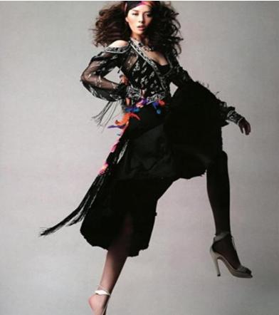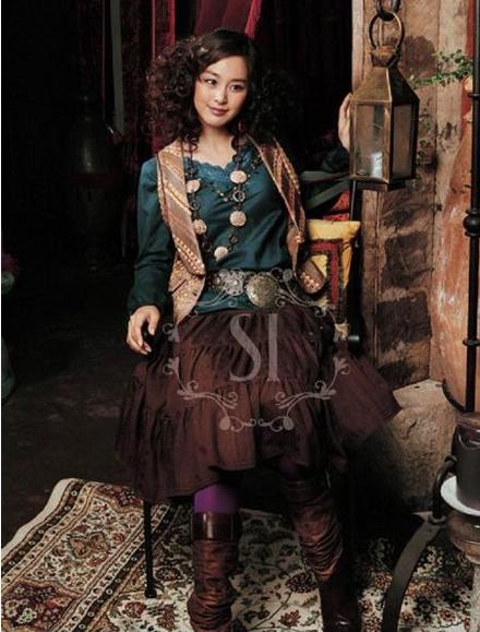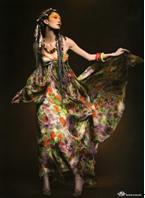 像人们所认为的那样,那些吉普赛人以歌舞艺术和占卜为生,一路散播着印度文化,同时也在不断吸取着各国艺术的特色,最终在西班牙产生了令世界瞩目的弗拉明戈舞蹈,这基本上全都是来自于吉普赛人的功劳。他们颠沛流离,居无定所,风餐露宿,总之你能想到所有的辛苦词都可以放在他们身上,但是他们似乎天生就是艺术的化身,他们的生命就蕴含在艺术当中,如果说如此的成就来自他们的执著追求仿佛倒多了几分刻意。那应该说是天性,活泼豪放、诱惑和激情,以及对美的无拘无束的热爱,都可以说是吉普赛特色。或许这也是《La Boheme》又译做《艺术家的生涯》的可行性吧,剧中人看起来并不像是吉普赛人,但是他们却有吉普赛人的性格和追求。米亚风格服饰。吉普赛人善于收集他们所经过的地区的特色,因此到达欧洲中部时的吉普赛民族风格服饰已经是各种民族风格的杂糅。多褶大摆裙应该是本地的斯拉夫特色,东斯拉夫、后来的俄罗斯也是类似的装束,各种闪亮的碎片、首饰大概是从印度带出来的,流苏和坠饰可能来自于取道中东波斯、北非摩洛哥的那一系人。吉普赛风格决不能是简约派的,他们无法去追求一件上好质地的衣物,然后小心翼翼地供起来,他们只能一点一点地添置和补充,从而形成了繁复的风格。他们也无法总是保持衣着光鲜,年轻的吉普赛姑娘喜欢的鲜艳衣裙也总是很快在流浪中变得黯淡破旧,但是他们会想办法让这些旧衣服看起来尽可能地美。这是这些人的真实状况,是现代社会里的人无法复制和模仿的美。