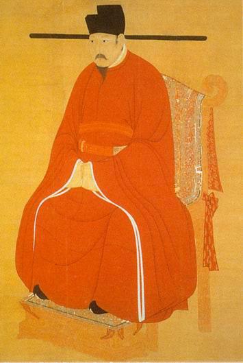 从三位皇帝的衣着来看,正是场合,都是黑色的翅冠,红色的朝服,皂靴。