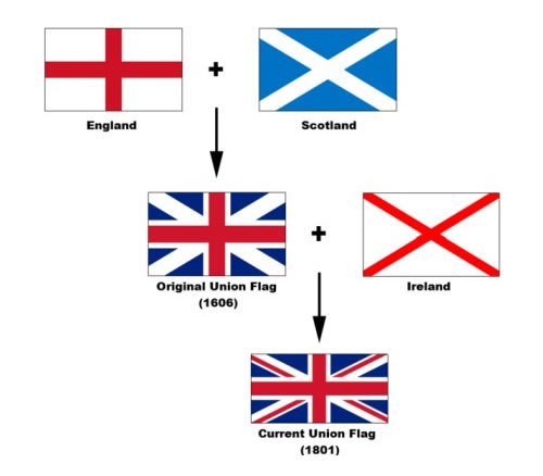 英国国旗:旗中带白边的红色正十字代表英格兰守护神圣·乔治,白色交叉十字代表苏格兰守护神圣·安德鲁,红色交叉十字代表爱尔兰守护神圣·帕特里克。