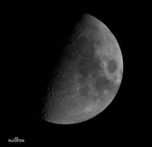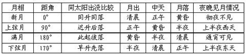 约在农历每月初七、初八,由于月球绕地球继续向东运行,日、地、月三者的相对位置成为直角,即月地连线与日地连线成90度。地球上的观察者正好看到月球是西半边亮,亮面朝西,呈半圆形叫上弦月。上弦月约正午月出,黄昏时,它出现在正南天空,假设观察者位于北半球中纬度,子夜从西方落入地平线之下,上半晚可见。