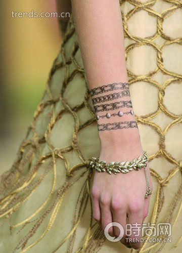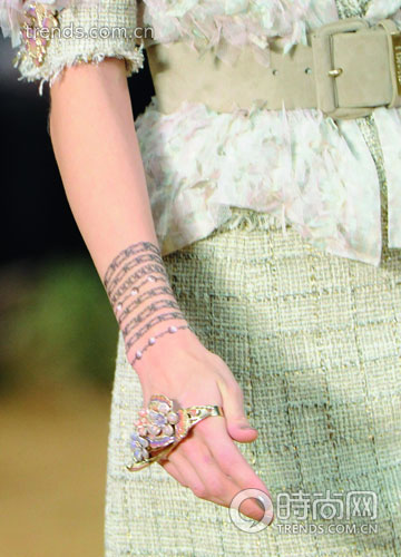 导语:在Chane2010春夏秀上,模特展示了各种纹身图案,就好像戴着精美绝伦的Chanel项链、手链和脚链。2010,纹身贴纸在Chanel的带领下将会变成最大的一个潮流。
