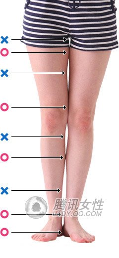美腿就是,有5处并拢,4处空隙的腿。具体来说,就如以下图片所示,标有○的5处(大腿,膝,腓,脚脖子内侧,脚尖)左右紧贴在一起,标有×符号的4处(大腿和根儿之间,大腿和膝之间,膝和腓之间,腓和脚脖子之间)是处于分开的状态。