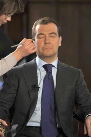俄罗斯总统德米特里·梅德韦杰夫在接受BBC采访前化妆。(摄于2009年3月29日,英国伦敦)