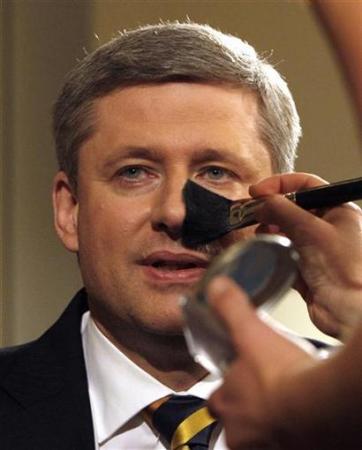 加拿大总理斯蒂芬·哈珀在上镜前化妆。(摄于2008年10月11日,加拿大魁北克省朗基尔市)