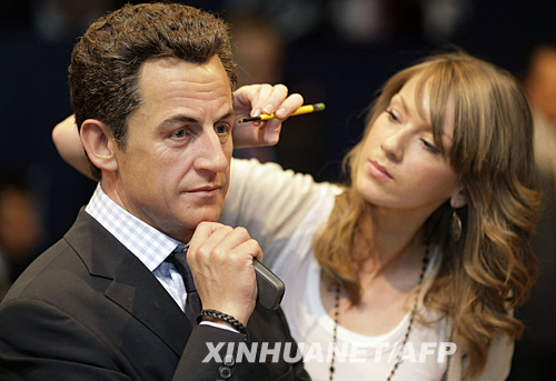6月5日,在英国伦敦的杜莎夫人蜡像馆,一名工作人员在修饰现任法国总统萨科奇的蜡像。当日,法国总统萨科奇的蜡像在伦敦杜莎夫人蜡像馆揭幕。
