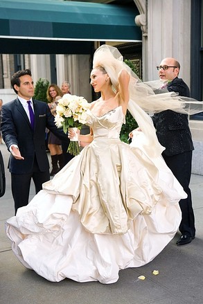 在《暮光之城》的贝拉出嫁之前,莎拉·杰西卡·帕克(Sarah Jessica Parker)在2008年电影版《欲望都市》中饰演的凯莉就穿了薇薇安·威斯特伍德(Vivienne Westwood)的婚纱。