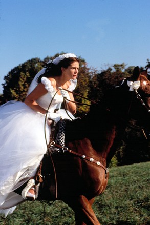 茱莉亚·罗伯茨(Julia Roberts)在1999年影片《落跑新娘》(Runaway Bride)中身穿蓬蓬裙婚纱多次逃走。