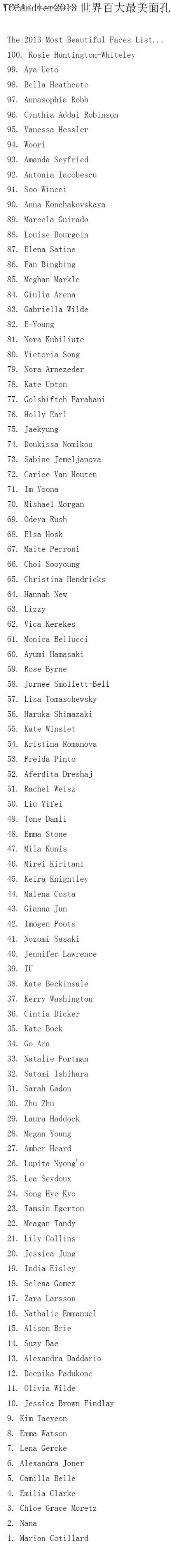 美国电影网站《TC Candler》毎年都会公布“百大最漂亮面孔女星”:2013年冠军是Marion Cotillard,亚军是Nana(After School),泰妍第9,秀智第14,Jessica第20,宋慧乔第24,高雅拉第34,IU第39,秀英第66,允儿第71,宋茜-fx--victoria 第80!