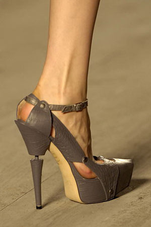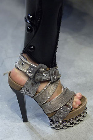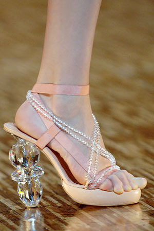 Viktor & Rolf这一季的服装比起前几季的奇思妙想略微朴素了一点,让人不由得猜想他们是不是把心思挪到了鞋款的设计上。切割成多棱面的水晶鞋跟高贵典雅,奠定了鞋款维多利亚式的古典宫廷装饰风格,鞋面的缎面绑带和水晶珠串装饰的细节也呼应了奢美雅致的格调。