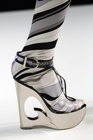 乍一看便能辨认出设计师的手笔,Emilio Pucci已经成为一种标签,与几何图形、线条、色快牢牢地系在了一起。这一季的Pucci换上了黑白灰的稳敛色调,流畅的曲线形勾画出科幻的风格,鞋款自然是未来风的延续,透明的鞋面以黑色勾出轮廓,类似钢质的鞋底冷静冰凉,只有曲线的镂空纹理还带着柔情的意味。