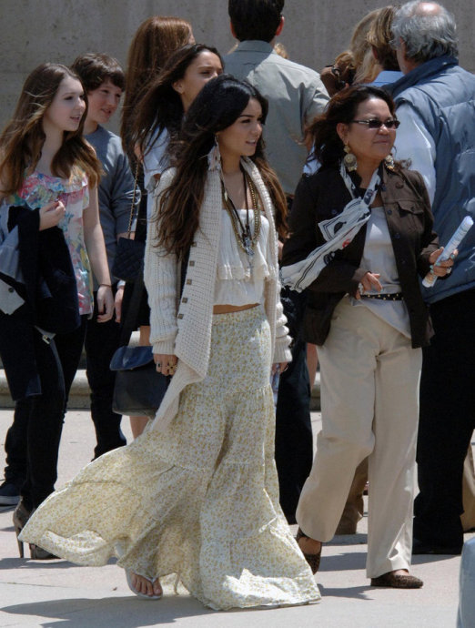 虽说个子不高还敢搭配如此飘逸的长裙勇气可嘉,但出现在街头的瓦妮莎·哈金斯看起来并不十分抢眼,甚至路人ABCDEFG都要比她还高出一些。