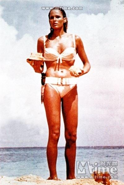 1962年,《007》系列的第一位邦德女郎乌苏拉·安德烈斯带着一股比基尼旋风刮过银幕。在这部《铁金刚勇破神秘岛》中,来自瑞士的金发美女出水芙蓉般地出现:身穿白色比基尼,腰间捆着一把猎刀,在蔚蓝的加勒比海中缓缓走来,美得令人窒息,沙滩女孩们纷纷效仿。她为之后的007系列电影奠定了天使容颜和魔鬼身材的邦女郎整体基调。