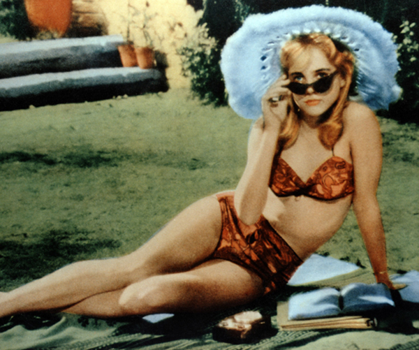 Sue Lyon在Stanely Kubrick执导的电影《洛丽塔》中大胆出演Lolita Haze一角。她在片中戴着大沿帽和猫眼墨镜、身着橙色热带印花图案比基尼的形象深入人心,为她赢得了当年的金球奖最佳新人奖。