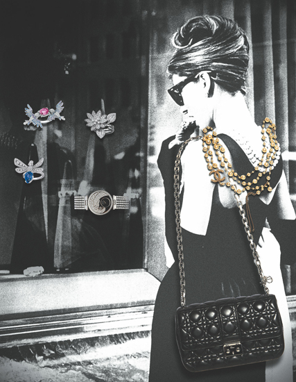 古老街角,Hepburn 身着小黑裙站立在一片精美而奢华的珠宝橱窗前,低调墨镜难挡她的优雅气质。