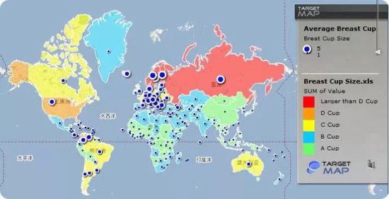 而在包括中国在内的诸多亚洲、非洲国家,则是一片“绿色”,意味着女性平均胸部仅为A罩杯。