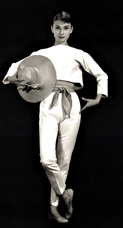 这是赫本最著名的一身打扮,黑色套头紧身上衣、修身七分裤,平底芭蕾舞鞋,直到现在这些仍然是时尚流行不可缺少的元素。