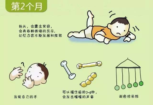 ▼第2个月:开始学习抬头,发现自己的手,偶尔会露出笑容,会有各种情绪的反应。