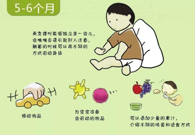 ▼5—6个月:有支撑能够独立坐一会,会喃喃自语引起别人注意,躺着的时候可以用不同的方式滚动身体。