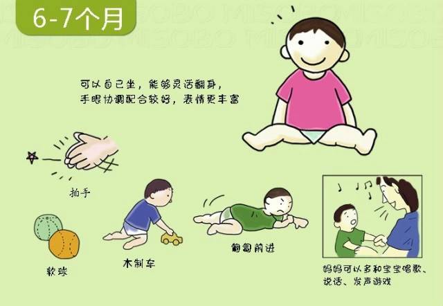 ▼6—7个月:可以自己坐、能够灵活翻身、表情更丰富。