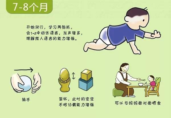 ▼7—8个月:开始爬行、发出的声音增多,理解成人语言的能力增强。