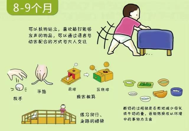 ▼8—9个月:可以扶物站立、喜欢敲打能够发出声音的物品,手部动作更加灵活。可以通过语言与动作配合的方式与大人交往。