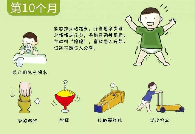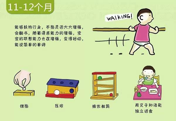 ▼11—12个月:能够扶物行走、手指灵活性大大增强,变得好动,语言能力增强,能说简单的单词。