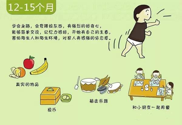 ▼12—15个月:学会走路,会弯腰捡东西,有强烈的好奇心,能够简单交流,开始有自己的主意。