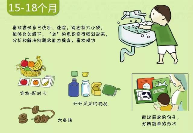 ▼15—18个月:喜欢尝试自己洗手、洗脸、能够自如蹲下。“我”的意识变得强烈起来,分析和解决问题的能力提高。能说简单的句子。