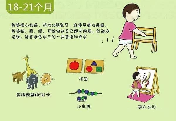 ▼18—21个月:能够搬动小物品,身体平衡力发展良好,开始尝试自己解决问题,能够表达自己的一些意愿和要求。