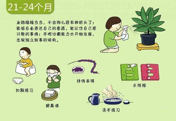 ▼21—24个月:走路稳定;能够自由表达自己的意愿;能够独立做一些事情,如洗手、上厕所等;手眼协调能力进一步加强。
