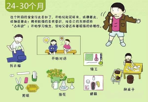 ▼24—30个月:独立穿衣服、折衣服;也可以做些家务,如擦桌子、擦鞋等;语言能力得到进一步提升,可以跟别人展开对话;拥有较强的自我意识,对自己的东西很有“占有欲”。