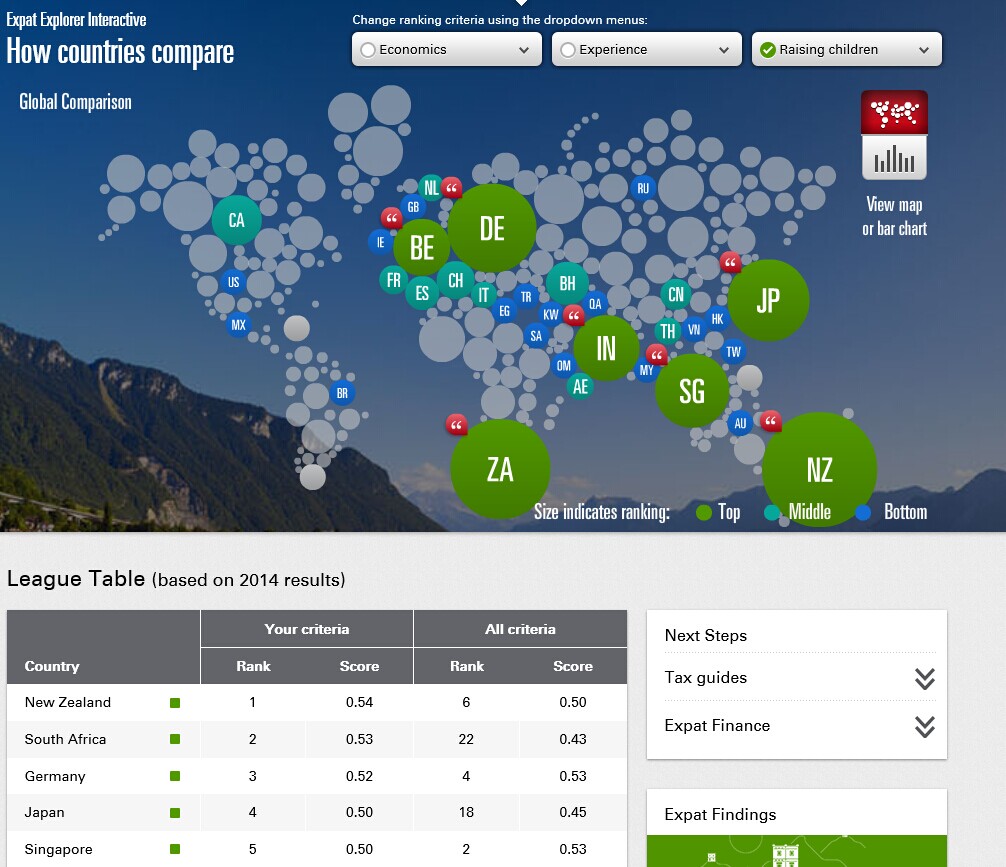 在HSBC《Expat Explorer Survey》中,在最适合养育孩子的移民地(Raising Children Abroad)的2014年度排行榜上,新西兰名列榜首,紧随其后的则是南非、德国和日本。