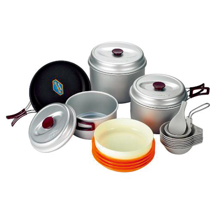 4个不同尺码的深底锅,一个煎锅,一个不锈钢小水壶, 5个餐盘, 10个碗,还有菜篮子、水果盘、折叠汤勺、饭勺等,足够一大帮人在户外吃上丰盛的一餐了。而且,这些盆盆碗碗也非常适应户外的环境。