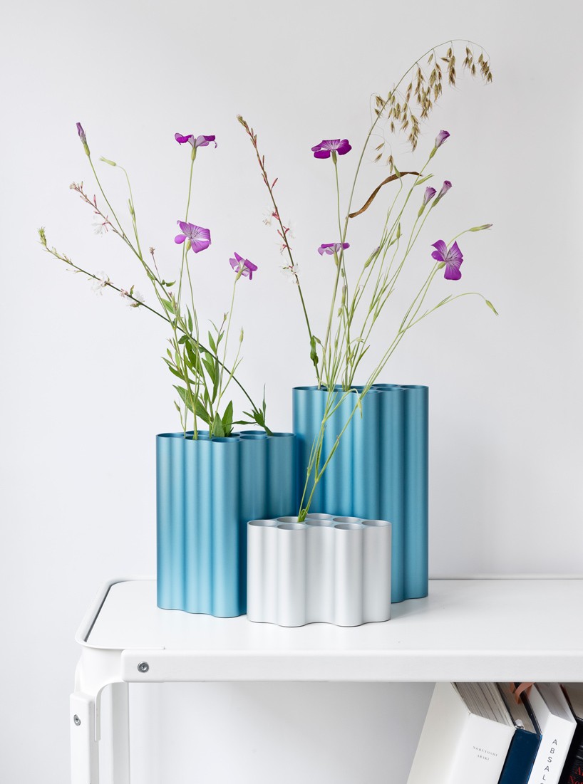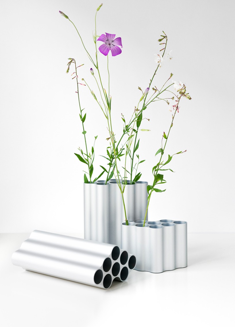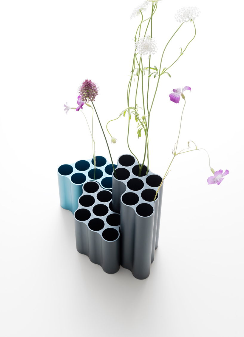 这 套花瓶最 近被应用在一个临时装置之中, bouroullecs采用了120个装满了花朵的容器,在德国莱茵河畔魏尔vitra 校园的消防站中显得极富诗意。最初的设计源自于将这些管子颠倒后侧方着堆叠在一起,后来在绘图作业中对其进行试验,于是nuage花瓶诞生了,使用者还可 以用不同高度与金属色调的铝制管来对其进行重新组装设计。
