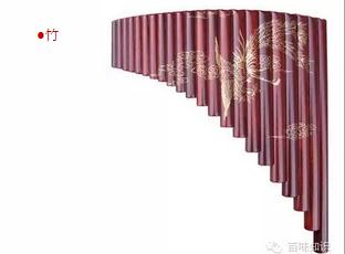 竹,是指竹类制成的乐器,主要有箫,笛,和管。其实比较简单的区别是直吹为箫,横吹为笛,二者虽然都是竹子作成的乐器,但性质和音色各有巧妙不同。如果想要进一步辨别箫和笛的不同,在于笛有膜,出音特别嘹亮,而箫无膜孔,音色柔和。在竹制的古乐器中,最重要的是排箫,它有发标准音的功用。(图为排箫)